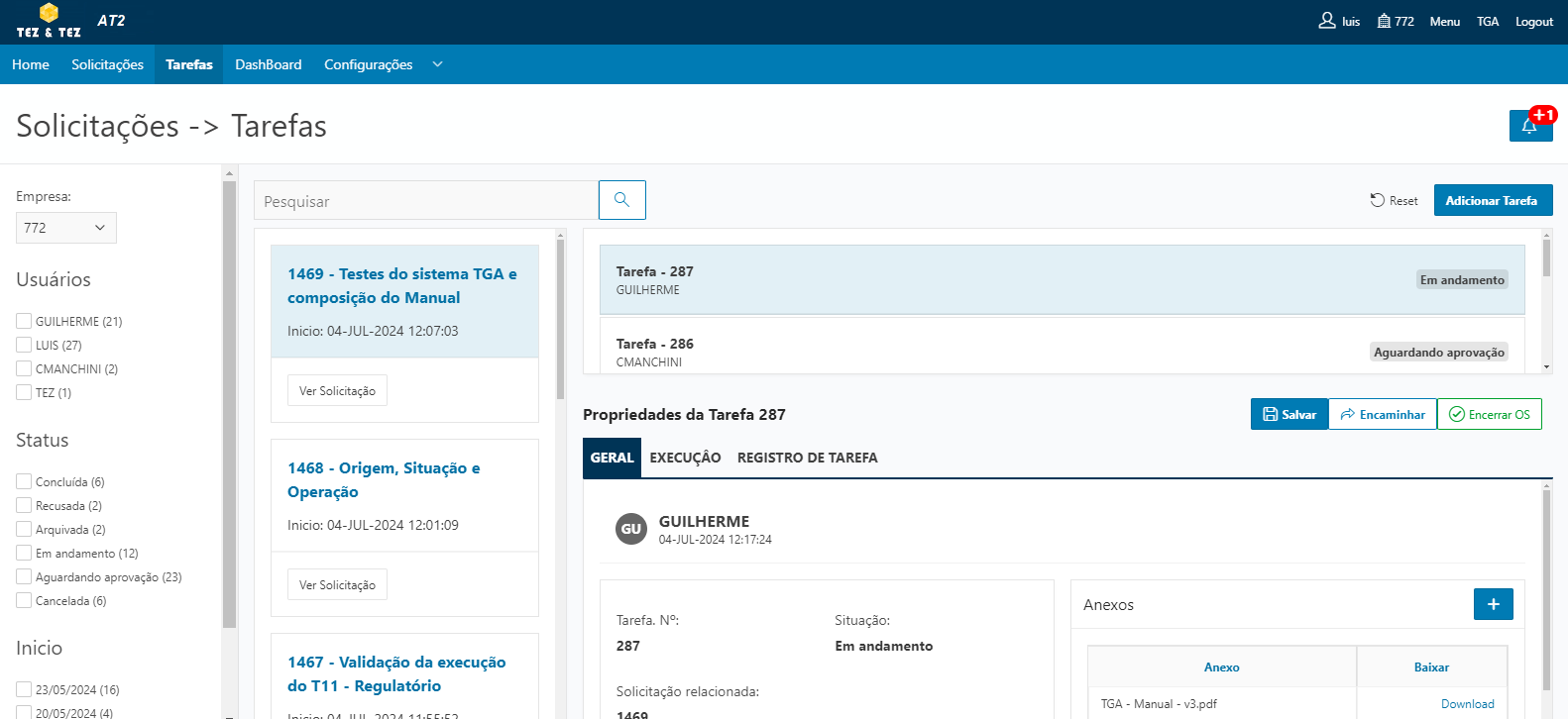 - Criação e delegação de tarefas a membros da equipe;