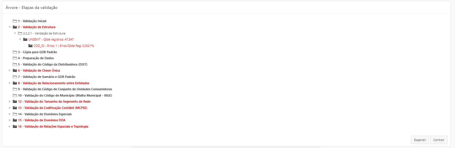 O processo de validação inicia-se com a recepção de arquivos (Shapefile, Excel, CSV ou DBF) e utiliza o Dicionário de Dados ANEEL (DDA) e o Manual de Controle Patrimonial do Setor Elétrico (MCPSE) para garantir a correlação correta das codificações. Relatórios de inconsistências são gerados para que usuários e gestores analisem e identifiquem discrepâncias, considerando fatores como área urbana ou rural e concessões.